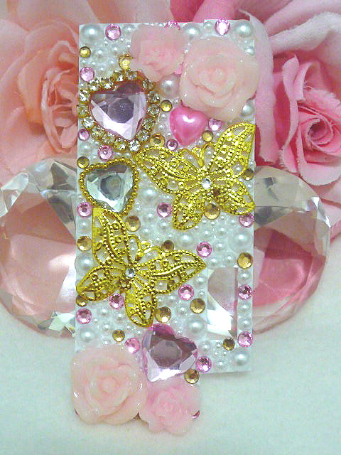 ダイヤカットストーンは高品質ラインストーン、激安ダイヤカットストーン、スワロフスキーをポイントで使用しています。蝶々と薔薇、姫系の白パール中心に、ゴールド、ピンクベースの甘いスイートなデザインです。