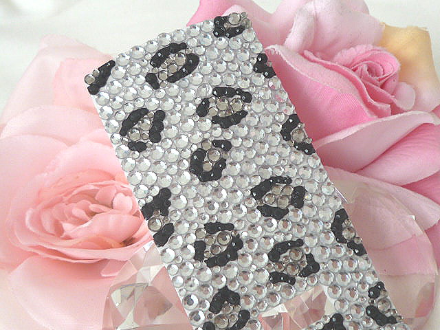 ラインストーンは高品質アクリルストーン、ダイヤカットストーンをミックス使用しています。大人っぽいクールなシルバーとブラック系のヒョウ柄デザインです。スタイリッシュなデコ電シートです